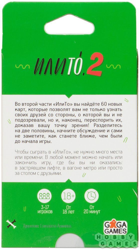 Карточная настольная игра "Илито 2" предложит вам массу тем для рассуждений в кругу друзей. 60 карт с вопросами, которые поделят вашу компанию на две противоборствующие стороны. Конфликта не миновать! Правила игры очень простые: один из игроков становится ведущим, он вытягивает карту из колоды и зачитывает с неё варианты ответа. Все остальные игроки по кругу озвучивают, что они выбрали и почему. Аргументы должны быть железными! Но на этом ещё не всё: после того, как игроки поделились своими ответами, они должны убедить ведущего в правоте своей позиции. Игрок, чьи доводы показались ведущему наиболее убедительны, получает победный балл.