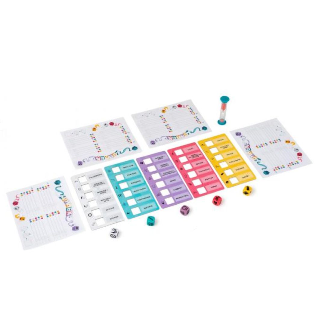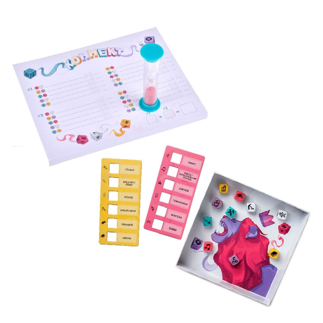 Настольная игра "Коннект" – это погружение в мир ассоциаций для вашей вечеринки. В компании от 2 до 8 человек вам предстоит найти явление, понятие или предмет, который связан с двумя значениями, выпавшими на кубиках. У вас есть 5 цветных кубиков с изображёнными на них рисунками, а также 5 цветных планшетов с 6 значениями, которые описывают рисунки на каждой грани кубика своего цвета. Просто бросьте 5 кубиков, разместите каждый в нужную ячейку на планшете своего цвета, а затем перейдите в свой лист для записи: в нём есть 10 строчек с различными комбинациями кубиков по цветам. Игроки записывают ассоциацию, которую у них вызывает объединения двух разных значений, а затем сравнивают свои записи. Ах, да, самое главное забыли – на всё про всё у игроков есть 3 минуты. Как только кубики будут разложены по местам, переверните песочные часы и начинайте мозговой штурм!