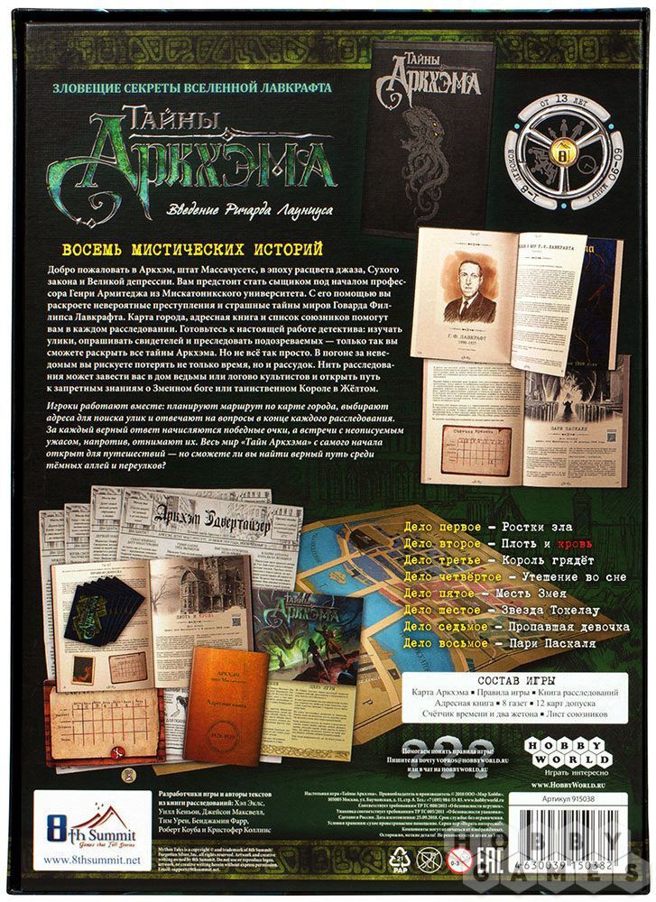 "Тайны Аркхэма" – это приключенческая детективная игра, в которой игроки, объединяя свои способности к детективному ремеслу, расследуют странные события в восьми сценариях (чем дальше, тем сложнее дело). Вы будете вести дела независимо от Армитеджа, а в конце сможете сравнить свои успехи, ответив на ряд вопросов. Чем лучше справится ваша команда, тем выше будет победный счёт!