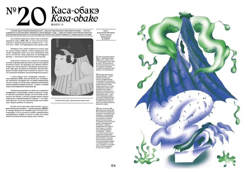 YOKAI - это энциклопедия японского фольклора с иллюстрациями современных художников. Здесь мы рассказываем о жутких и смешных повадках ёкаев. А ещё показываем этих существ - их образы осмыслили современные российские и украинские иллюстраторы. В проекте приняли участие более 40 художников.