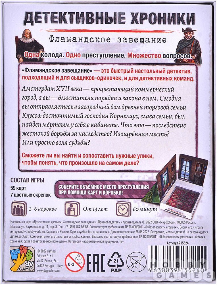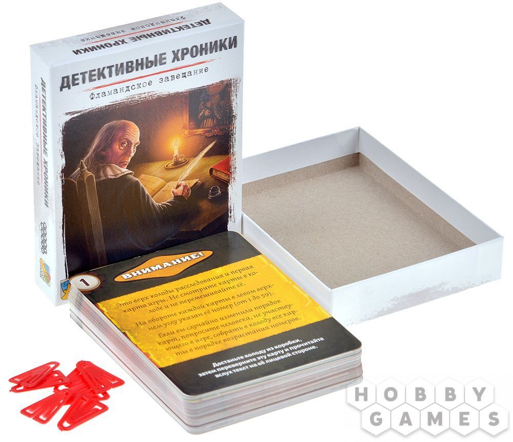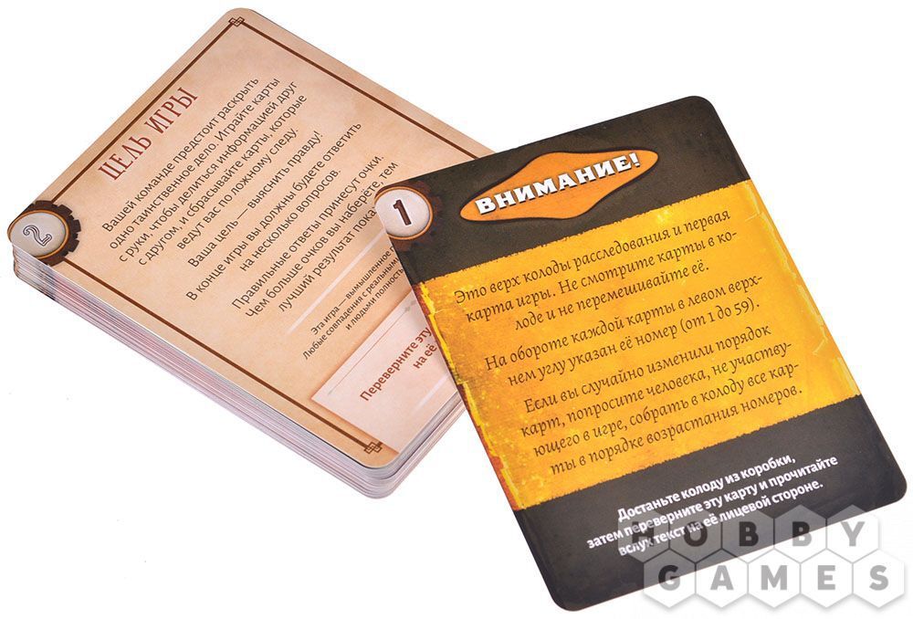 Колода карт расследования кладётся в центре игрового стола. Карты в колоде нельзя перемешивать и подсматривать, игра начинается с верхней карты. Прочитайте текст на первой карте. В начале игры участники соберут из коробки объёмное место преступления, а далее игра сама расскажет вам, что делать дальше, и в какой последовательности.