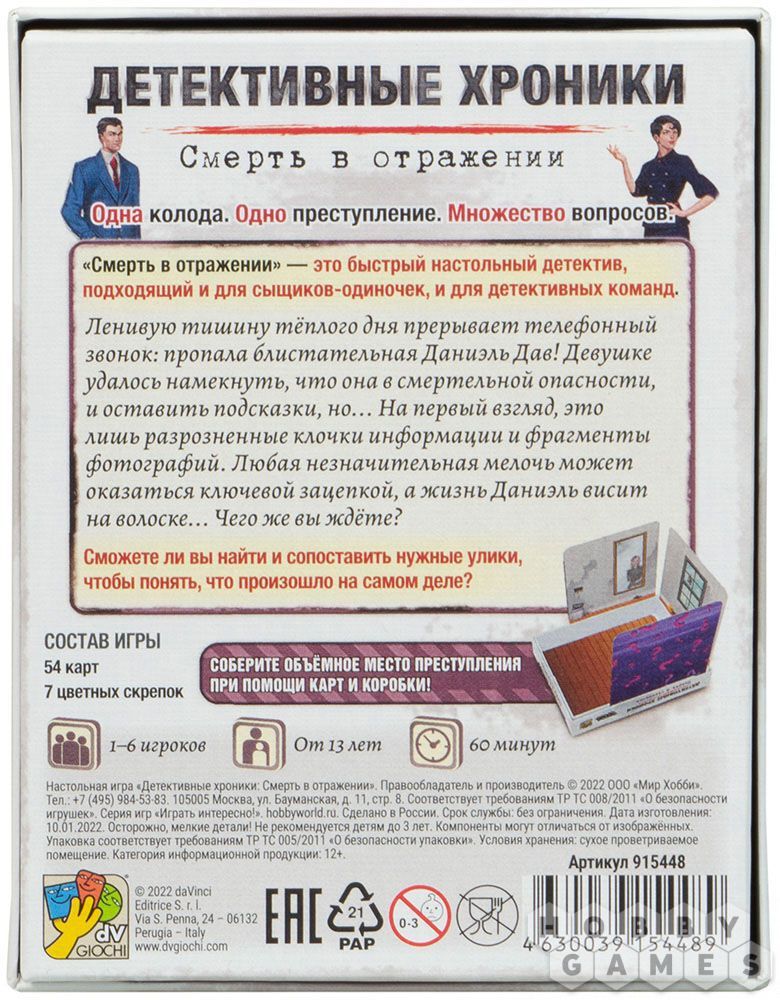 "Детективные хроники: Смерть в отражении" – это игра о совместном расследовании, в которой рассказывается о произошедшем преступлении. Игроки должны сообща раскрыть загадочный случай. Они разыгрывают свои карты, чтобы делиться информацией, сбрасывают карты, которые, по их мнению, приведут их в неправильное русло, обсуждают найденные улики, делают гипотезы и выводы, чтобы найти решение!