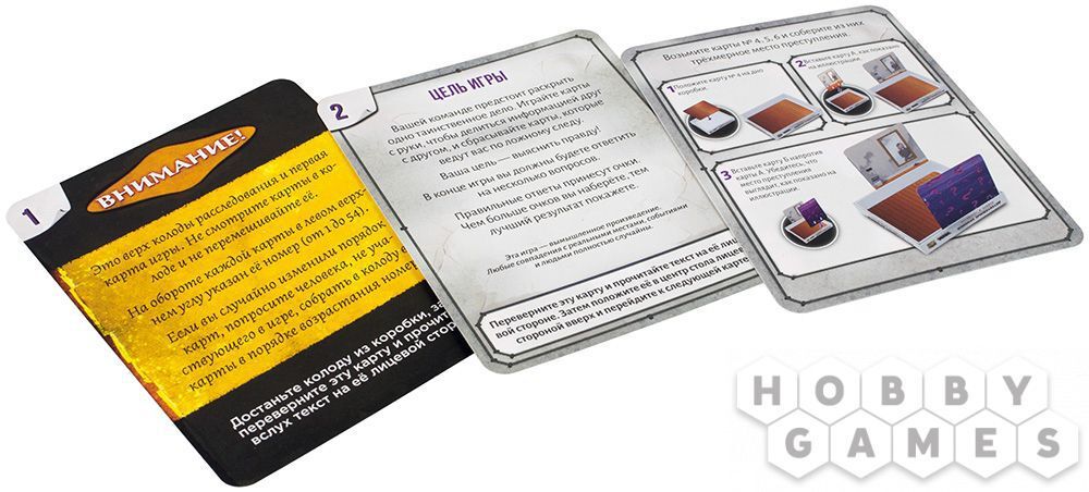 Колода карт расследования кладётся в центре игрового стола. Карты в колоде нельзя перемешивать и подсматривать, игра начинается с верхней карты. Прочитайте текст на первой карте. В начале игры участники соберут из коробки объёмное место преступления, а далее игра сама расскажет вам, что делать дальше, и в какой последовательности.