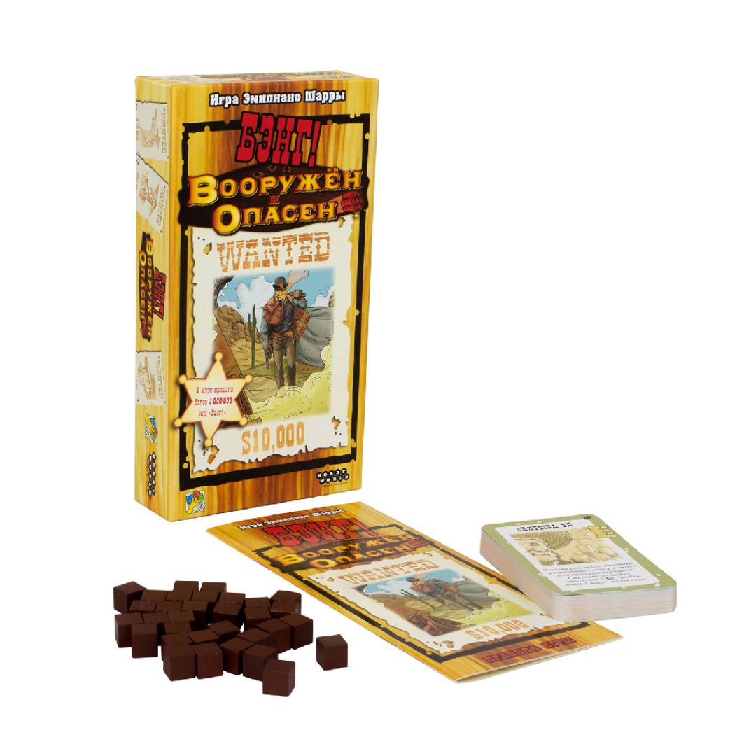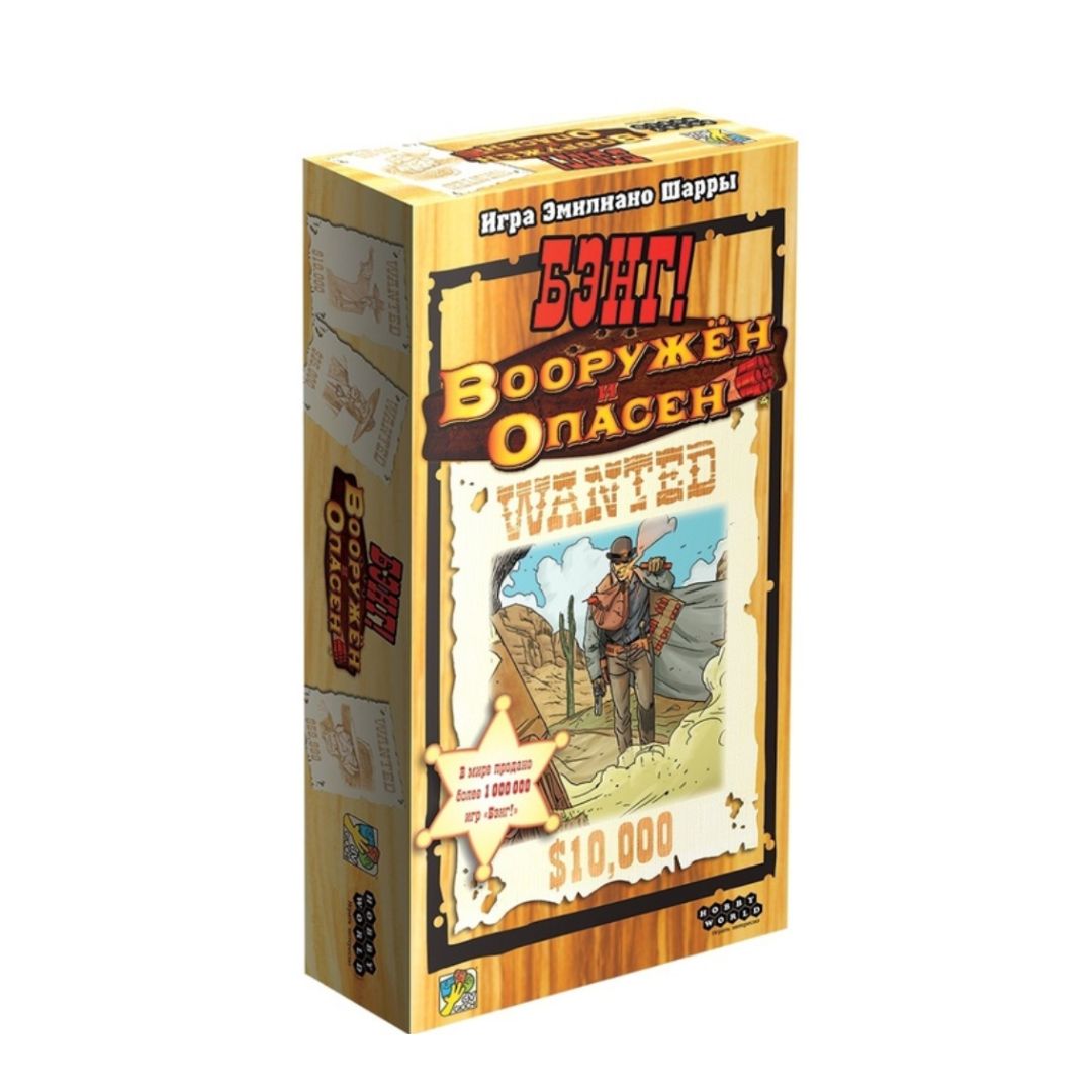 "Вооружён и опасен" – долгожданное дополнение к карточному бестселлеру "Бэнг!", в котором появляются восемь новых персонажей. Они вооружены бескомпромиссными громовержцами, бьющими точно в цель двустволками и дальнобойными карабинами Шарпса. В колоде представлены новые карты улучшения в коричневой рамке, влияющие на исход игры. Они могут повысить уровень здоровья или усилить эффекты других карт. В дополнении сохраняются и старые карты, однако знакомые символы комбинируются иначе. Вам необходимо включить всё внимание, чтобы расшифровать потенциал каждой карты и остановить беззаконье!