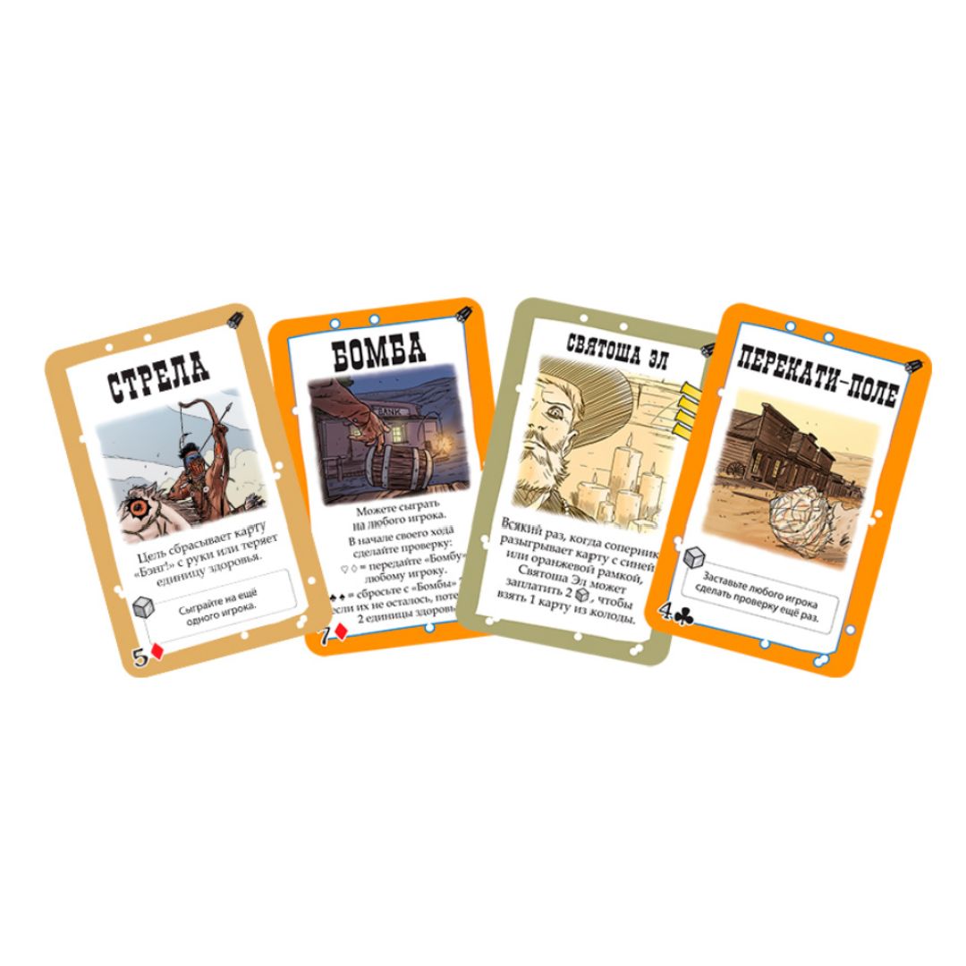 Игроку со счастливой рукой предлагается замешать карты персонажей и игровые карты в колоду базовой игры. В центр стола, который является некоторым хранилищем, помещается запас кубиков зарядов, регулярно пополняющийся или истощающийся. В ходе игры, при необходимости, вы сможете перемещать кубы из середины, активируя карты или оплачивать ими эффекты. Для карт опасности в оранжевой рамке меняется механика взаимодействия. На них изображены опасные оружия, которые позволяют сыграть карту "Бэнг!" против соперника, находящегося на расстоянии, допустимом для конкретной карты. Помните, что в свой ход вы можете воспользоваться картой "Бэнг!" лишь раз. Чтобы активировать другого персонажа, вы также должны использовать кубики, перемещая их с карты на карту.