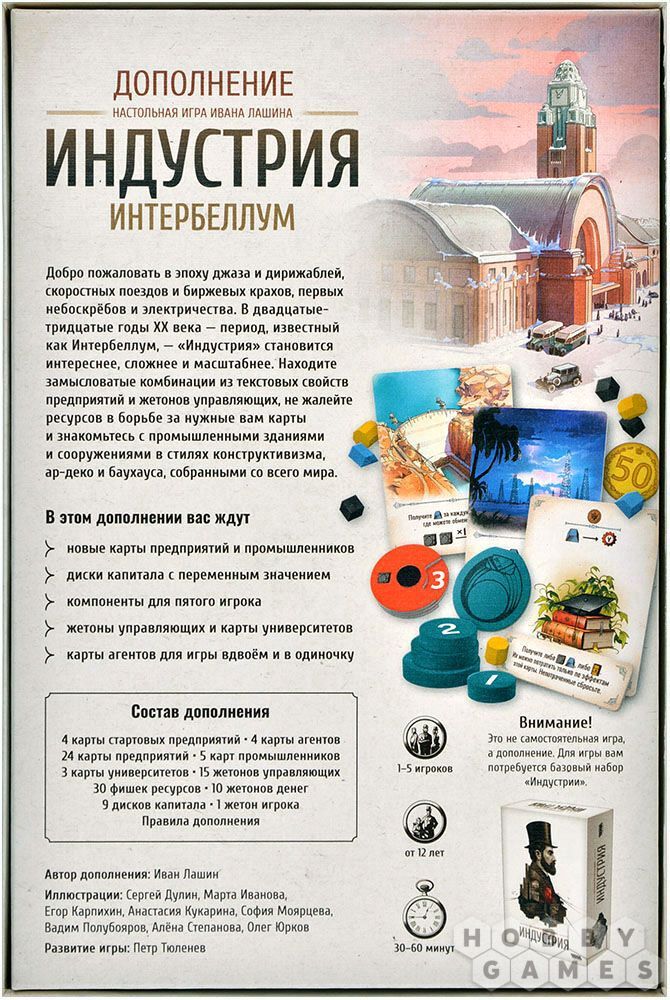 "Индустрия: Интербеллум" расширяет возможность базовой версии игры "Индустрия"! В коробке вас ждут новые карты предприятий и промышленников, диски капитала, имеющие переменные значения, а также карты университетов, карты агентов для игры в соло-режиме и все необходимые компоненты для включения в игровой процесс пятого участника!