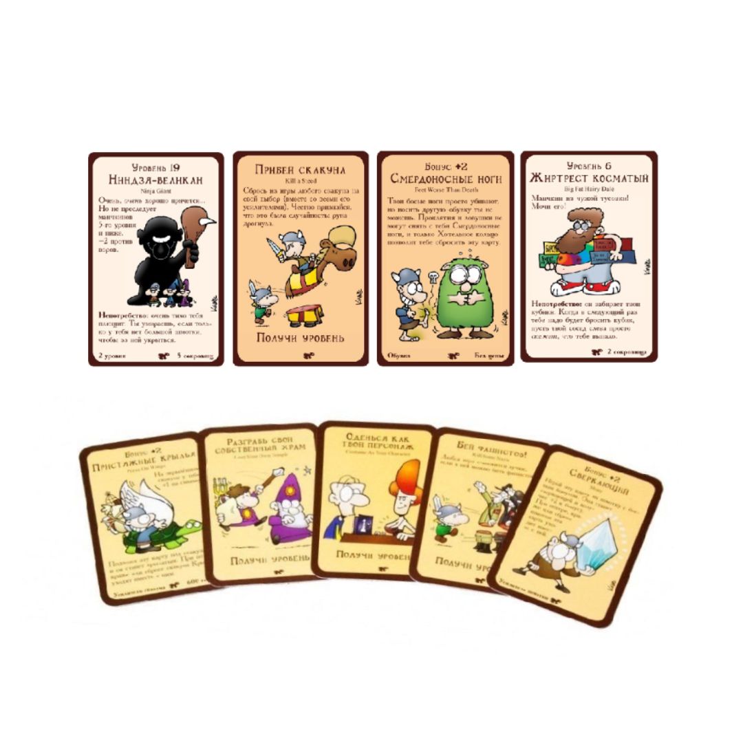 В начале партии игроки начинают как обычные люди своего пола (да-да, в игре есть даже различие полов!) первого уровня. В ваш ход вы выбиваете дверь, то есть переворачиваете верхнюю карту колоды дверей, и выполняете условия, написанные на карте. Если же это карта монстра, то вам не повезло и придётся вступить с ним в бой. Когда сила игрока больше или равна силе монстра, тогда игрок побеждает и может взять столько карт сокровищ, сколько указанно на карте с монстром. Во время боя другие игроки могут помогать товарищу и вступить с ним в бой, или же мешать и всячески усиливать вылезшего врага. Если игрок побеждает в бою, то он получает один уровень. В течение партии игроки будут применять на себя разные классы и профессии, менять свой пол, напяливать различные шмотки, пить подозрительные зелья, а также сражать самых разнообразных монстров!