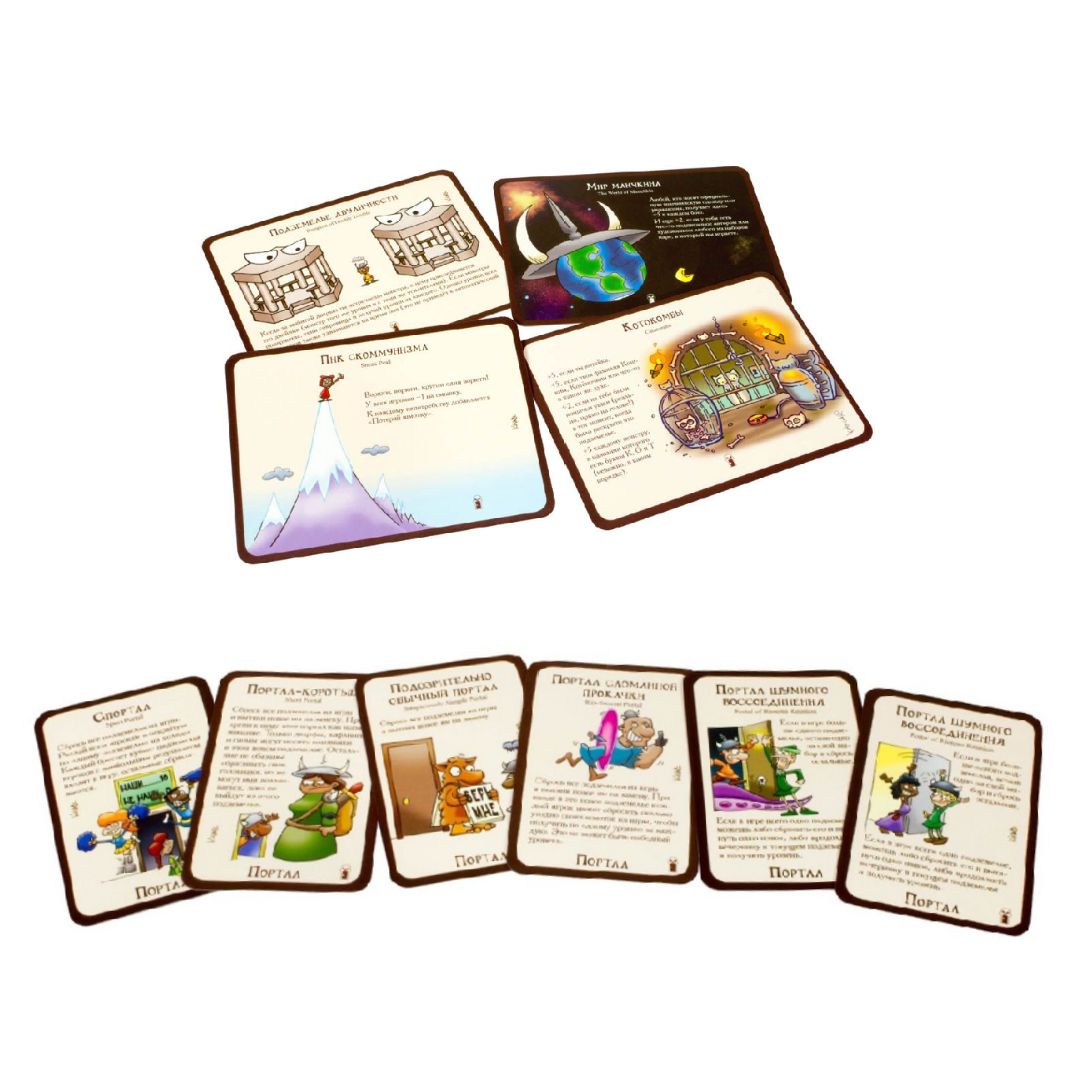 Внутри вы найдёте 16 новых карт порталов и 20 карт подземелий нового формата. Карты порталов замешиваются в колоду дверей и так или иначе взаимодействуют с колодой подземелий. Всё очень просто и дико интересно!