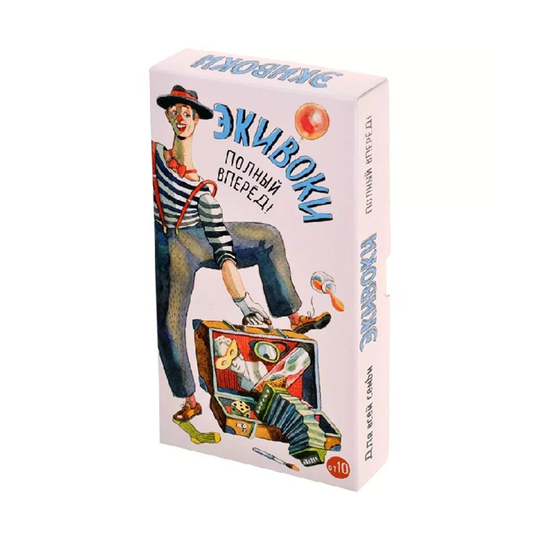 "Экивоки. Полный вперёд!" – это компактная дорожная версия вышеобозначенной настольной игры, в которой вы найдёте 72 карты с новыми заданиями, объединёнными тематикой путешествий. Здесь дорога и небо, города и страны, а также всё то, что можно встретить в них, начиная от достопримечательностей и заканчивая сувенирами и песнями. Время в пути пролетит незаметно, это уж точно!