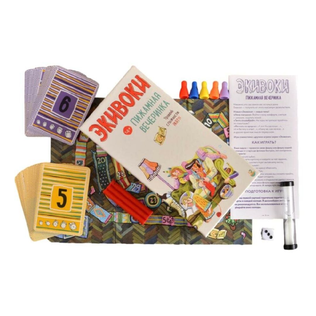 "Экивоки. Пижамная вечеринка" – это новая игра из серии "Экивоки", которая содержит 90 новых карточек со словами на темы "Мечтать не вредно", "Танго со шваброй" и "Лень-матушка". "Экивоки" – серия игр для компании, в которой нужно объяснять слова с помощью пения, рисования, лепки из пластилина и других интересных способов. А ключевой момент, который привлекает любителей патигеймов – это слова на карточках, старательно подобранные разработчиками игры, чтобы сделать вашу игру максимально уютной и весёлой. Игра посвящается времени, проведенному в стенах дома, независимо от того, что послужило для этого причиной: интроверсия, болезнь или просто леность. Да и какая разница? Главное поскорее занять стратегическую позицию – диван. В коробке вы найдёте всё необходимое для игры, добавить нужно только аксессуары для рисования, например, карандаш и чистый лист бумаги. Игра рекомендуется вместе с "Экивоки. Мама запретила" и хорошо сочетается с другими играми серии "Экивоки".