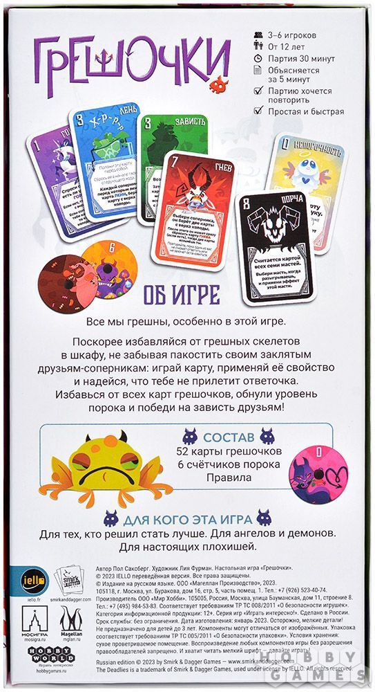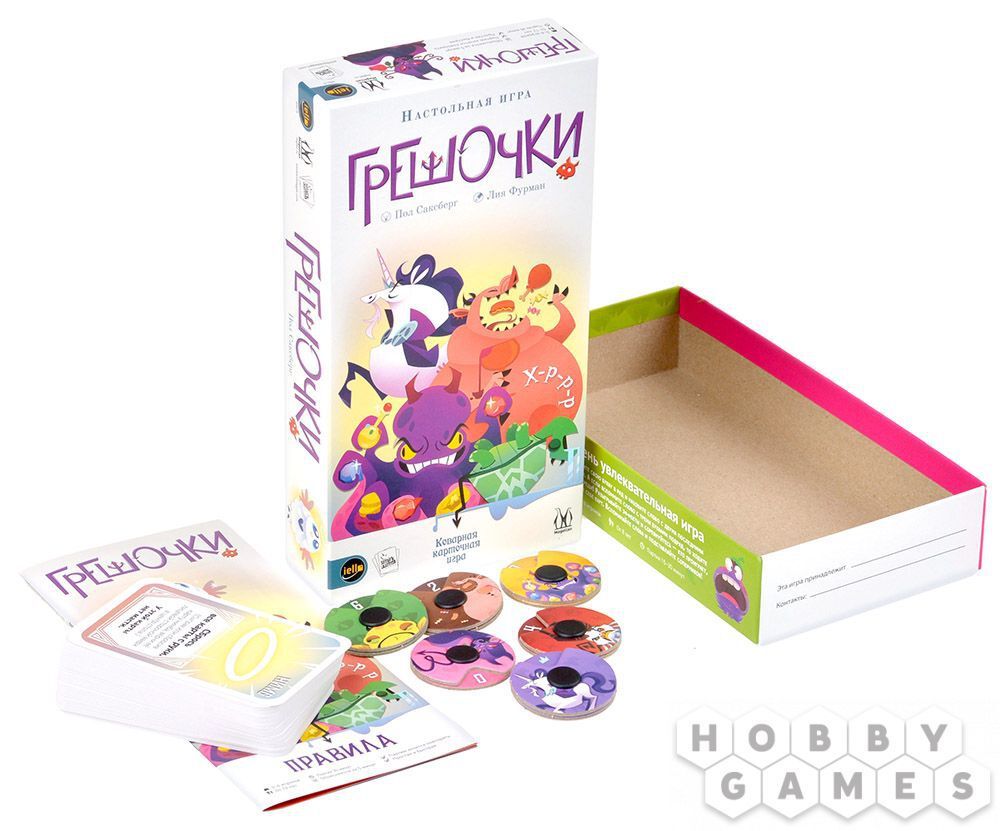 "Грешочки" – это весёлая карточная игра для компании от 3 до 6 человек. А ещё она простая, как пареная репа! В этой игре вам и остальным игрокам нужно как можно скорее избавиться от карт грехов с руки и обнулить свой уровень порока: выкладывайте карту на стол, применяйте её эффект против других игроков, и будьте готовы к тому, что "ответочка" прилетит в любое время.
