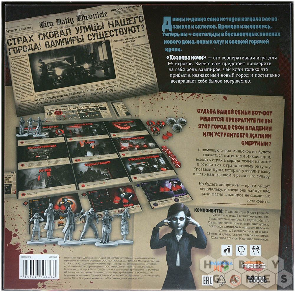 "Хозяева ночи" – это кооперативная настольная игра, где вы будете управлять вампирами, что желают подчинить своей воле город. Единственный способ сделать это – провести ритуал Кровавой луны, для которого вам придётся тщательно планировать действия, расправляться с агентами Инквизиции, перемещаться по городу и прибегать к магии. Днём вы будете скрываться от инквизиторов и наблюдать за городской жизнью, а ночью – выходить на охоту, вербовать приспешников и готовиться к ритуалу. Но время играет не на ваc: чем дольше вы колеблетесь, тем сложнее будет провести ритуал Кровавой луны, а потому не дайте загнать себя в угол и действуйте решительно!