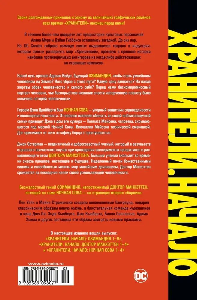 Серия долгожданных приквелов к одному из величайших графических романов всех времен «Хранители» наконец перед вами! В течение более чем двадцати лет предыстории культовых персонажей Алана Мура и Дэйва Гиббонса оставались загадкой. До сих пор. Но DC Comics собрал команду самых выдающихся творцов в индустрии, которые смогли развернуть мир «Хранителей», протянув в прошлое истории наиболее противоречивых антигероев из когда-либо действовавших на страницах комиксов. Какой путь прошел Адриан Вейдт, будущий Озимандия, чтобы стать умнейшим человеком на Земле? Кого убрал с этого пути? Какую цену заплатил? На какие жертвы обрек человечество и самого себя? Перед нами бескомпромиссный портрет человека, чье бескорыстное желание спасти испорченную планету было оплачено потерей человечности. Героем Дэна Драйберга был Ночная Сова — упорный защитник справедливости и воплощение честности. Отчаянное желание сбежать из неблагополучного дома приводит Дэна в дом его кумира — Холлиса Мейсона, человека, скрывающегося под маской Ночной Совы. Впечатлив Мейсона технической смекалкой, Дэн принимает от него эстафету борца с преступностью. Джон Остерман — педантичный и добросовестный ученый, который в результате страшного несчастного случая при проведении эксперимента, превратился в расщепляющего атом Доктора Манхэттена. Бывший ученый скользит во времени сквозь прошлое, настоящее и будущее. Свободный от всех земных оков, он наблюдает за временными потоками того, что уже произошло, могло произойти и еще только может. Наделенный почти божественными силами и способностью менять мир малейшим движением Доктор Манхэттен сражается за последние капли своей ускользающей человечности. Безжалостный гений Озимандия, непостижимый Доктор Манхэттен, летящий во тьме Ночная Сова – на страницах второго сборника. Лен Уэйн и Майкл Стражински создали великолепный бэкграунд, подарив классическим образам новую жизнь, а блистательная команда художников в лице Джэ Ли, Энди Кьюберта, Джо Кьюберта, Билла Сенкевича, Адама Хьюза и других, заставили эти образы заиграть новыми красками.