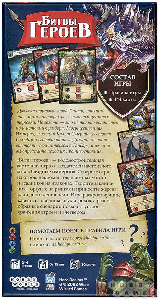 "Битвы Героев" – карточная колодостроительная игра для 2-4 игроков, которая является переосмыслением такого настольного хита как "Звёздные Империи", но на этот раз в захватывающем фэнтезийном сеттинге и с сюжетной кампанией.
