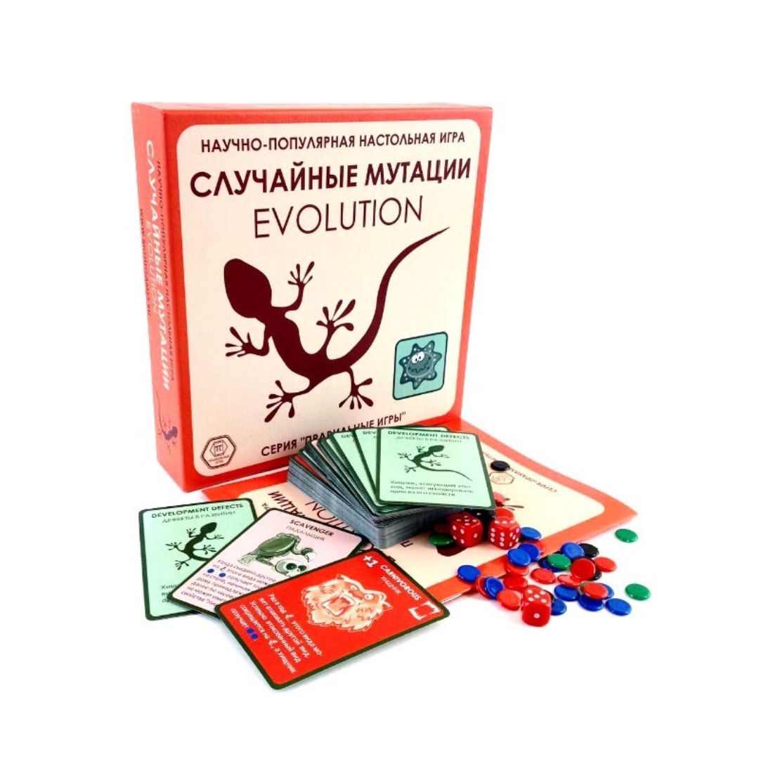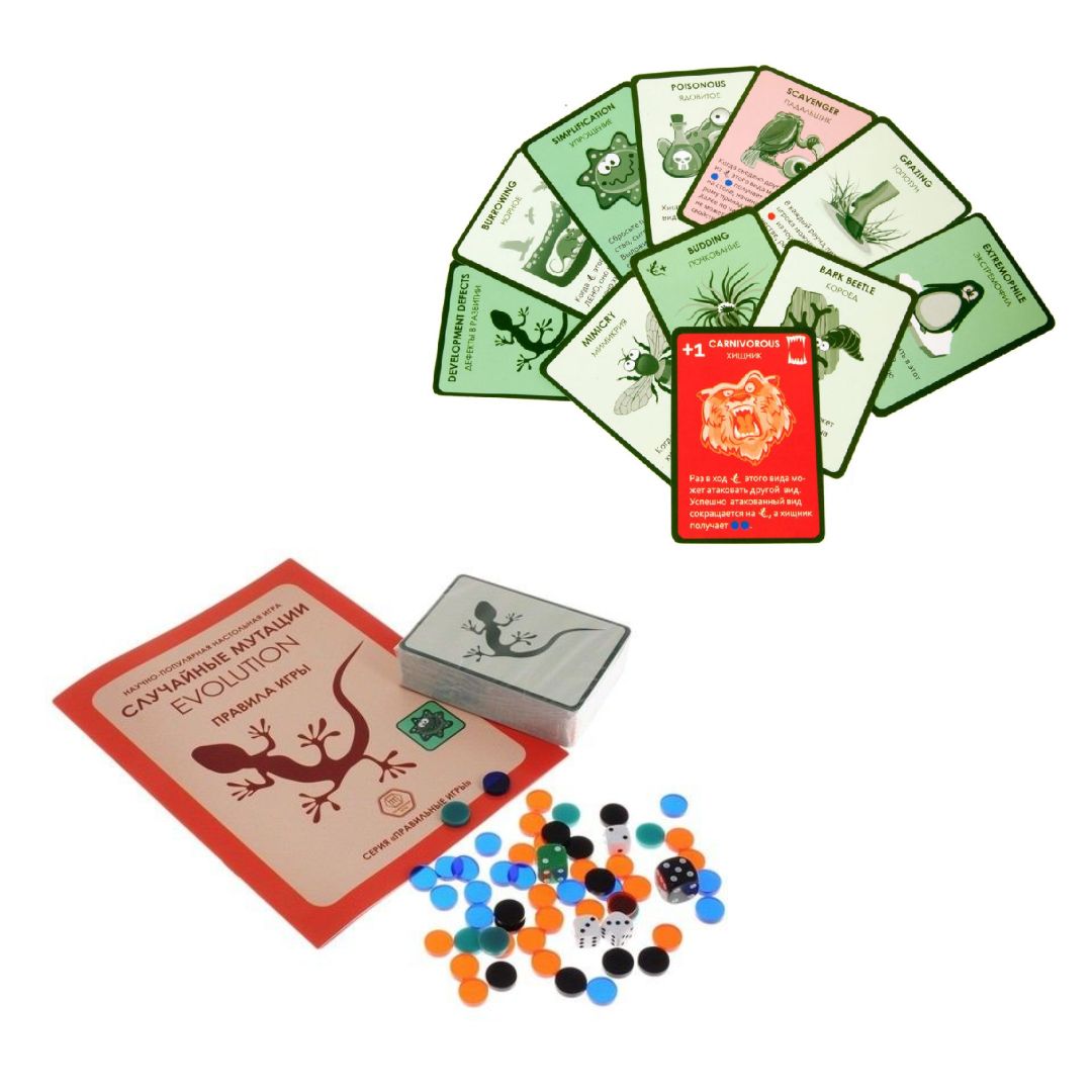Настольная игра "Эволюция Случайные мутации" – это самостоятельная игра серии, которая, однако, поддерживает карты из других версий. Данная версия отличается гораздо большим соответствием реальным механизмам эволюции. Теперь игроки не могут сами выбирать, какими именно свойствами будут обладать их животные, мутации получаются более правдоподобными. Из других нововведений стоит отметить также разделение хищников на обычных и облигатных и увеличение роли кубиков в игре: теперь они определяют количество корма на раунд, количество убежищ от хищников, а также паразитов.