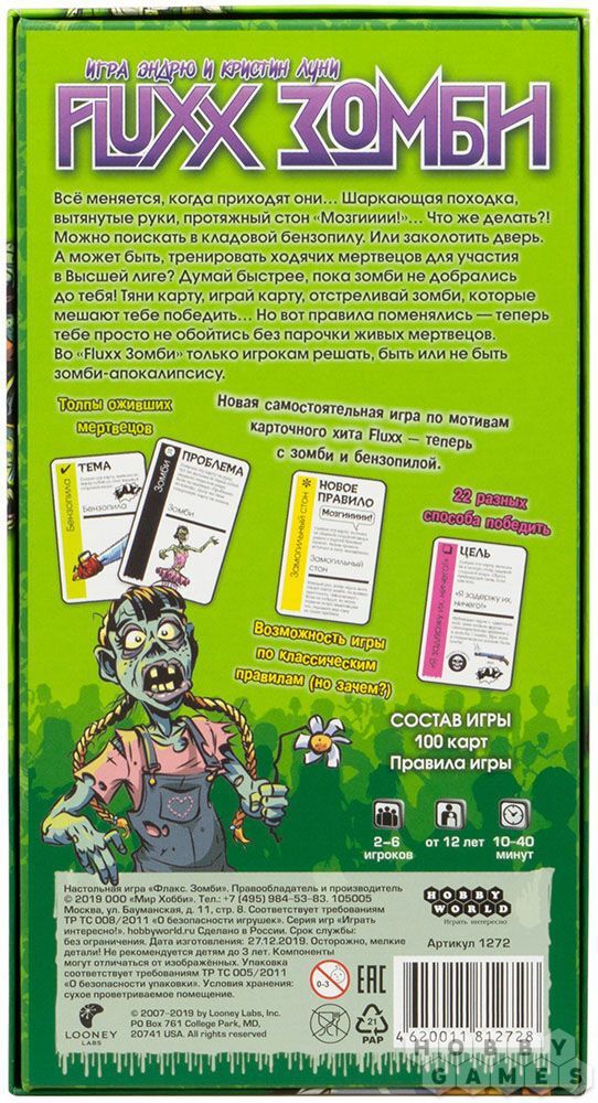 Правила остались прежними – тяни карту, играй карту. Еще минуту назад ты отстреливал зомби, а сейчас уже срочно ищешь хотя бы парочку! Во "Fluxx: Зомби" только вам решать, быть зомби-апокалипсису, или все обойдется.