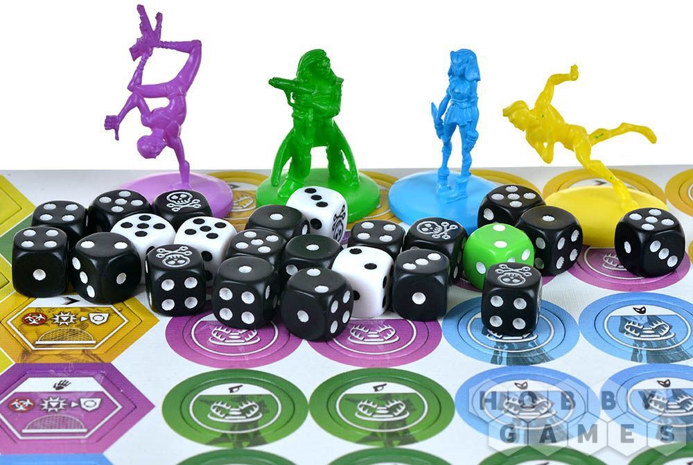 Движение. Поместите кубики в выбранные ячейки на карточке героя, выполняйте действия из доступных: перемещайтесь по карте, перестреливайтесь с противниками, а в конце боя подсчитайте цифры полученного и нанесённого урона.