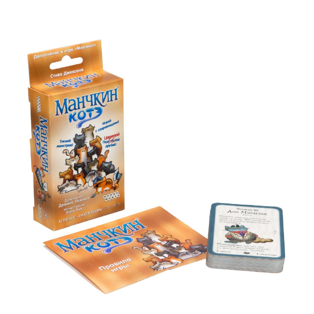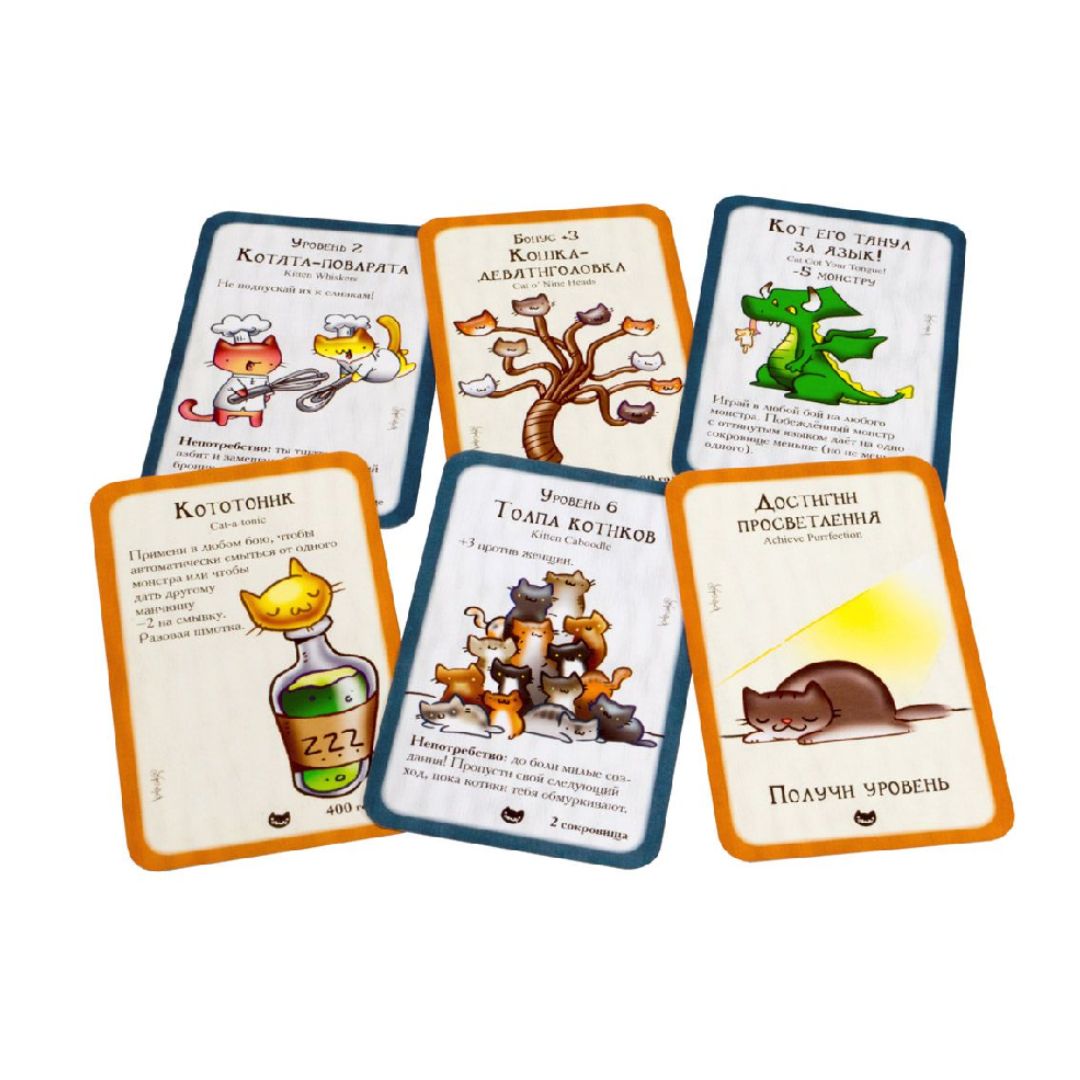 Внутри вы найдёте 30 новых карт – 21 карту дверей и 9 карт сокровищ с потрясающими артами. Милые котики покажут вам всё своё обаяние и свирепость! Готовьтесь встретить новых монстров: "Дона Мурлеоне", "Толпу Котиков" или "Котят-поварят"! Без новых шмоток дело тоже не обойдётся, чего стоит хотя бы "Кошка-девятиголовка" или карта "Достигни просветления"!