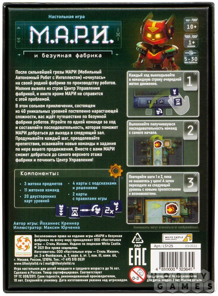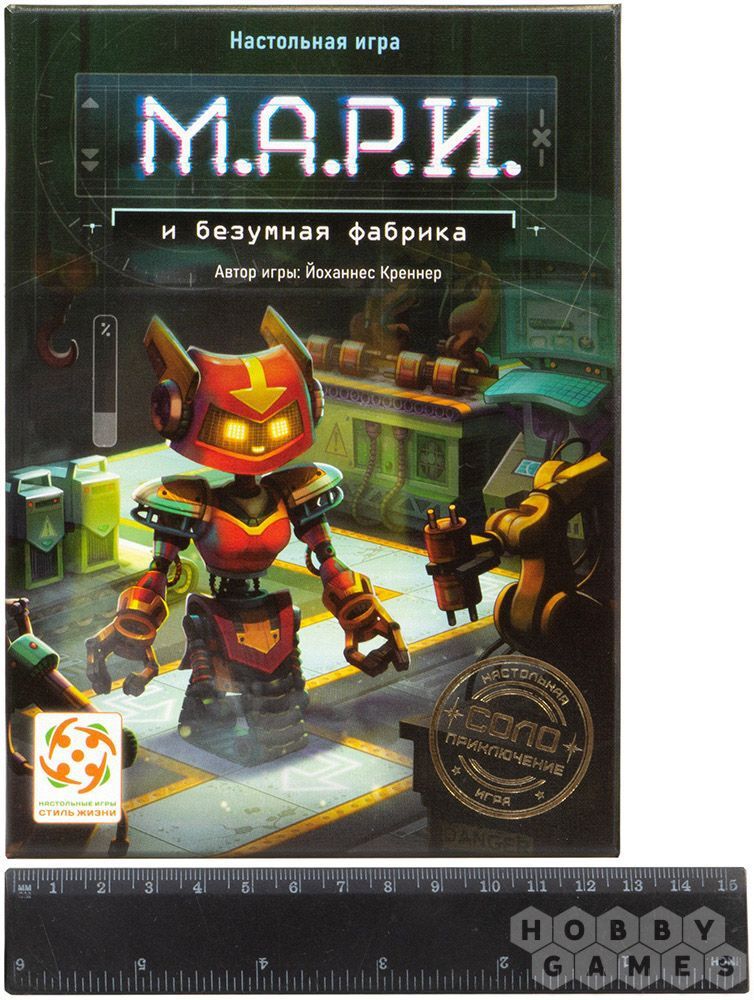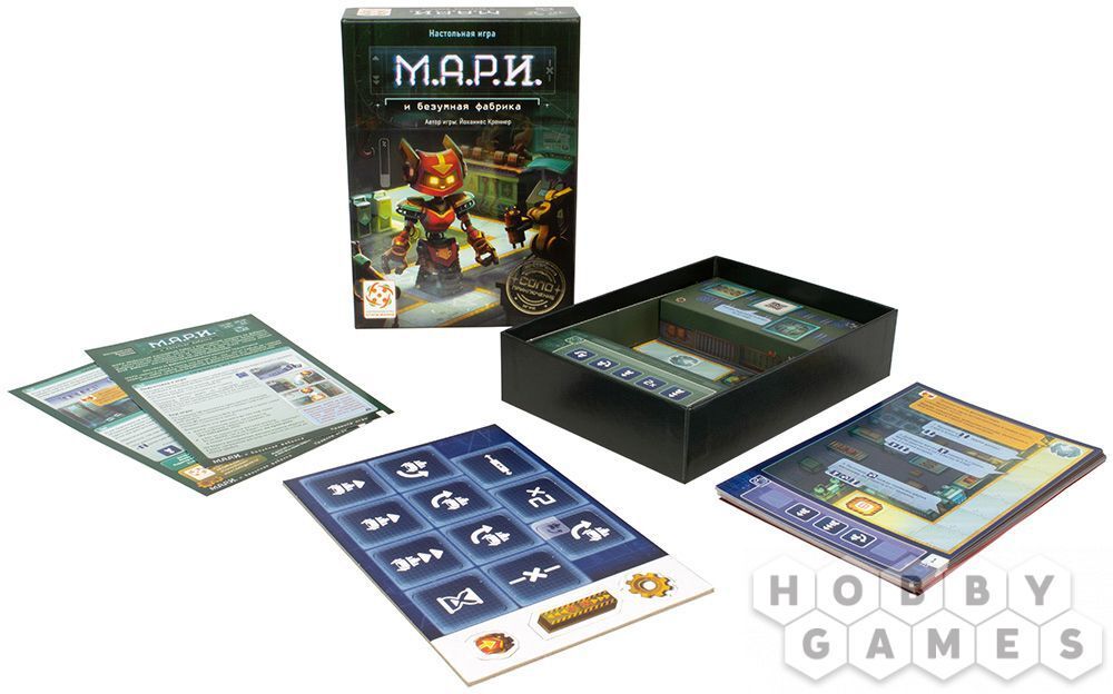 "М.А.Р.И. и безумная фабрика" – это карточная настольная игра на логику, в которой вам предстоит взять под управление робота. МАРИ подчиняется строгому алгоритму действий, поэтому каждый ход вы будете её программировать, чтобы МАРИ добралась до цели без происшествий. В игре 40 уровней различной сложности, которые вы будете проходить по порядку. И чем дальше вы пройдёте, тем безумнее будет становиться техника на заводе и сложнее становиться ваш путь.