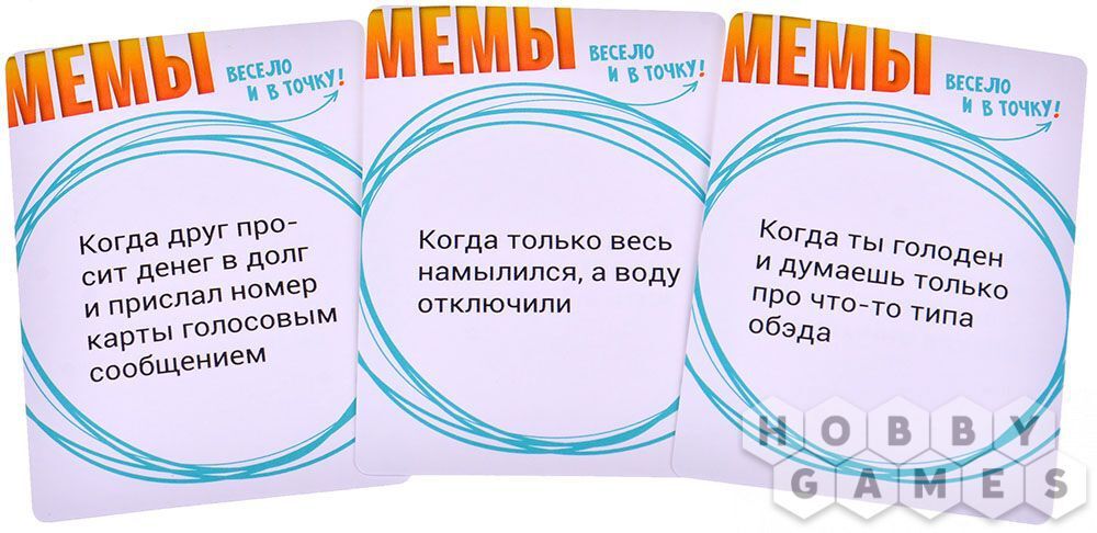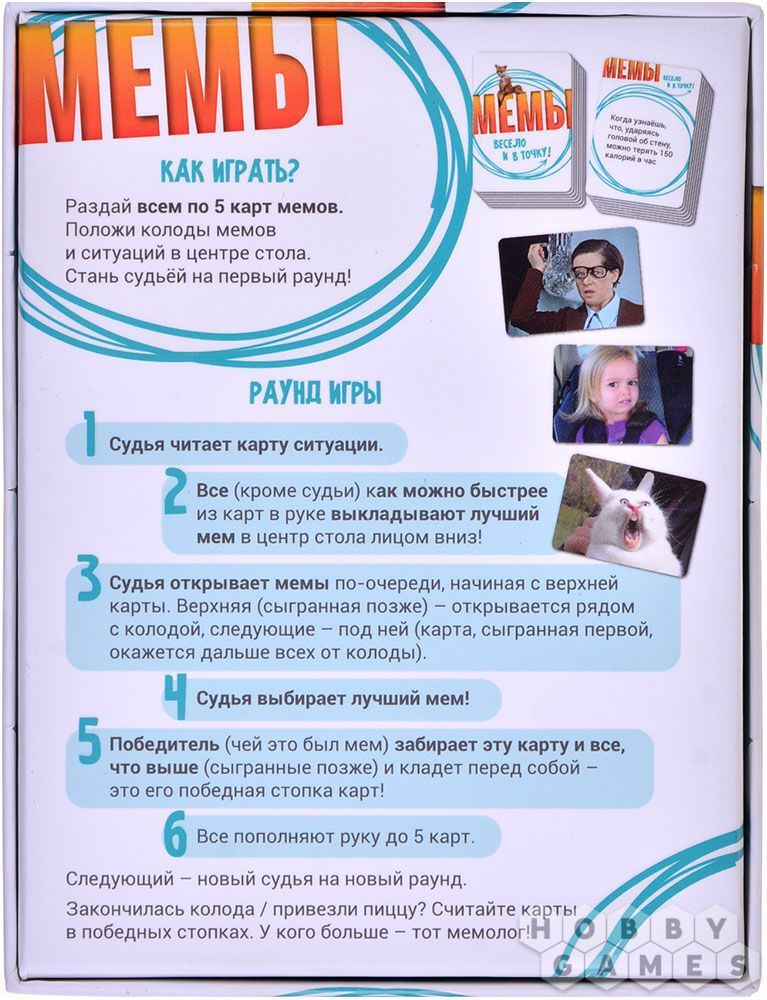 Правила игры "Мемы: Весело и в точку!" настолько просты, что объяснены прямо на коробке! В начале раунда ведущий зачитывает одну ситуацию – она может быть смешной, злободневной, неловкой или какой-либо ещё. Следом каждый игрок должен выложить из руки по одной карте мема, который, согласно его мнению, подходит для озвученной ситуации. Когда игроки закончат, ведущий выбирает лучший мем, а его автор получает часть оставшихся карточек в качестве трофеев. Тот, у кого стопка трофеев в конце игры окажется наиболее внушительной, получает почётное звание главного мемолога вашей тусовки!