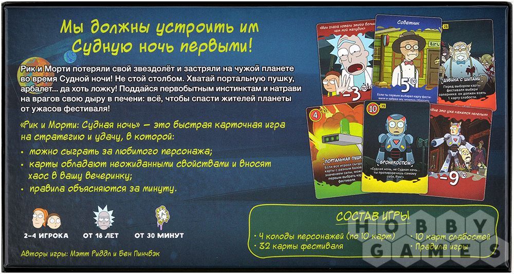 Об игреКаждый игрок берёт под контроль одного из четырёх персонажей: это Рик, Морти, Лавочник и Артриша. Все они обладают уникальными колодами из 10 карт, что содержат невероятные приёмы и примочки. Огнемёты, пушки, ракеты – в Судной ночи все средства хороши!