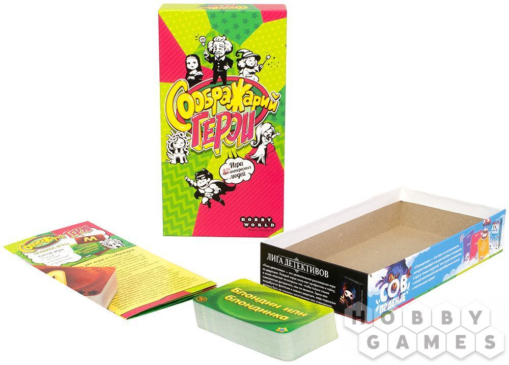 Игра "Соображарий: Герои" совместима с играми серии "Соображарий". Вы можете смешивать наборы этих игр в любой комбинации, а если смешаете их все, получите несколько сотен разных заданий!