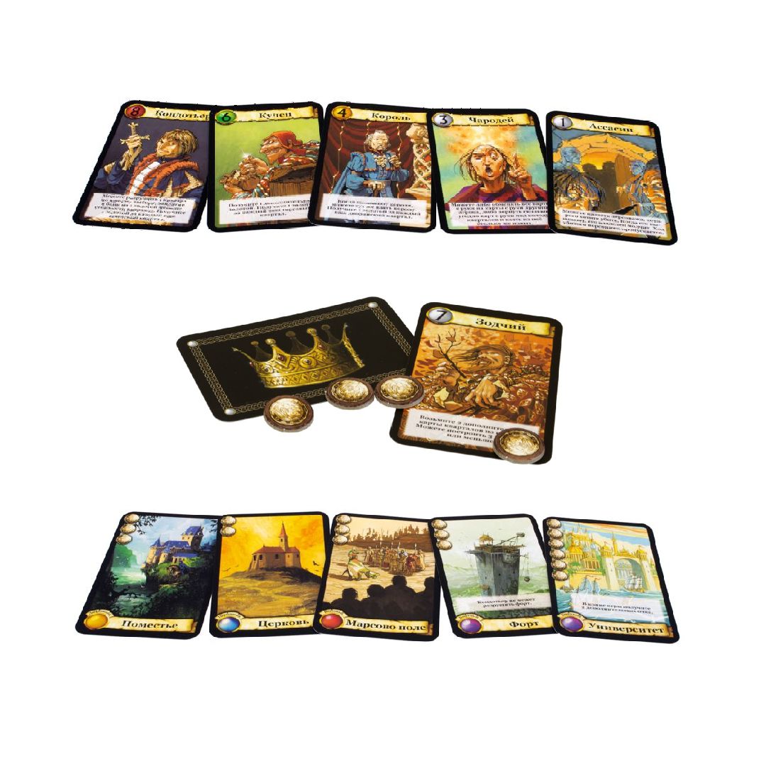 Один из игроков станет старшим и получит карту короны. Ему предстоит следить за очерёдностью ходов и вызывать персонажей в установленном правилами порядке. Игра начинается с выбора персонажей. Первым делом определяется, какие персонажи не будут участвовать в игре, причём при игре вшестером или всемером участвуют все. Несколько (количество карт зависит от количества игроков) карточек выкладываются в открытую, то есть все игроки знают, что они не участвуют, и одна взакрытую. Если в открытую выложен король, он возвращается в колоду и вместо него вытягивается другой персонаж. Потом все по очереди, начиная со старшего игрока, выбирают персонажа из оставшихся и передают карты сидящему слева сопернику. Если вас семеро, последний игрок получит от шестого одну карту, а вторую возьмёт со стола (ту, что выкладывается взакрытую).