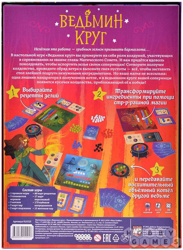 В игре "Ведьмин круг" ваша задача – собрать в своём ведьмином круге пять ингредиентов до того, как это сделают другие. Прибегайте к уловкам, способностям персонажей и выбирайте подходящие рецепты – только не забывайте, что ведьмы-соперницы не дремлют, пока вы варите своё зелье...