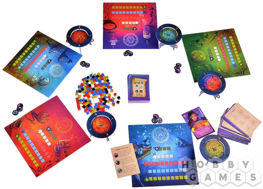 Один из главных аспектов игры – все выполняют действия одновременно! Для ведьмы всегда найдётся дело, а потому скучать в ожидании своей очереди точно не придётся. Игроки постоянно передают друг другу ресурсы и карты, так что крайне важно следить за развитием ситуации и вовремя увидеть выигрышную тактику. В круговороте магии, колдовских ингредиентов и рецептов зелий легко потерять голову – стоит зазеваться, и вот, соперницы уже вовсю портят ваше зелье!..Впрочем, всегда есть возможность отыграться: в вашем распоряжении колдовство и ведьминские хитрости!