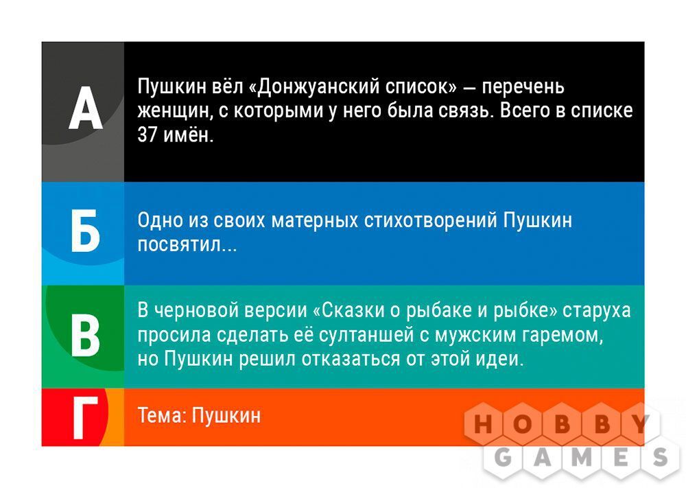 "Г" – грандиозный блеф. Выбрав этот вариант, игрок должен полностью выдумать факт на тему, обозначенную в этом варианте