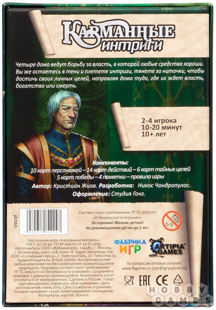 В настольной карточной игре "Карманные интриги" вы станете настоящим серым кардиналом и будете стремиться к тому, чтобы ваша дворянская семья получила имперскую власть. В этой борьбе разрешается использовать любые средства. Если вы захотите убить человека, то вы это сделаете, и даже не придётся долгие годы выслеживать жертву при помощи посредников.