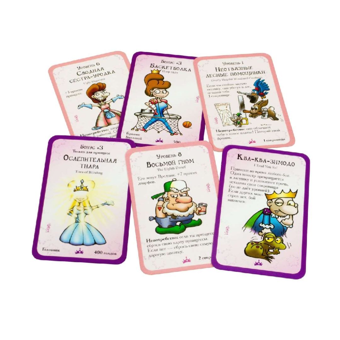Внутри вы найдёте 15 новых карт – 9 карт дверей и 6 карт сокровищ. Помимо новых монстров ("Сводная сестра-уродка") и шмоток ("Баскетболка"), в комплекте вы найдёте две карты принцесс. Эти карты не считают ни за класс, ни за расу, поэтому принцессой сможет стать кто угодно. Помимо статуса, обретённого величия и невероятной красоты, игроки получают новую способность – в бою без помощников принцесски получают +3 за каждого монстра в бою, что весьма неплохо.