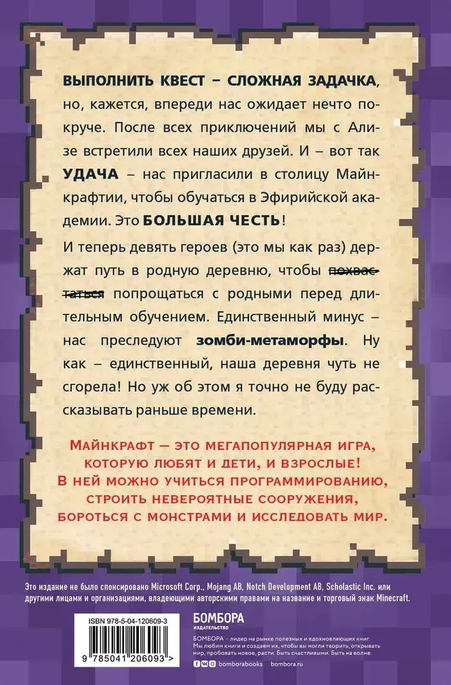 После всех приключений мы с Ализе встретили всех наших друзей. И — вот так удача — нас пригласили в столицу Майнкрафтии, чтобы обучаться в Эфирийской академии. Это большая честь! И теперь девять героев (это мы как раз) держат путь в родную деревню, чтобы попрощаться с родными перед длительным обучением. Единственный минус — нас преследуют зомби-метаморфы. Ну как — единственный, наша деревня чуть не СГОРЕЛА! Но уж об этом я точно не буду рассказывать раньше времени.