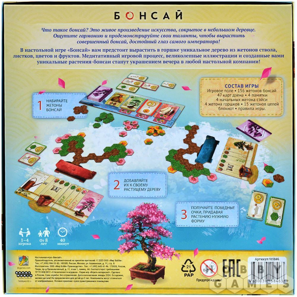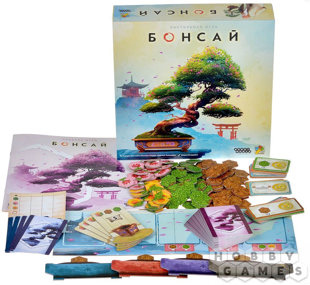 "Бонсай" – это игра, в которой вы будете выращивать миниатюрное дерево при помощи шестиугольных жетонов. Вы придадите своему бонсаю уникальную форму ствола, расположите жетоны листьев, цветов и фруктов именно так, как вы это видите! Уже с первых минут игра захватит вас своим медитативным процессом и погрузит в мир гармонии. А уникальные миниатюрные деревья, созданные лично вами, будут идеальным украшением вашего вечера!