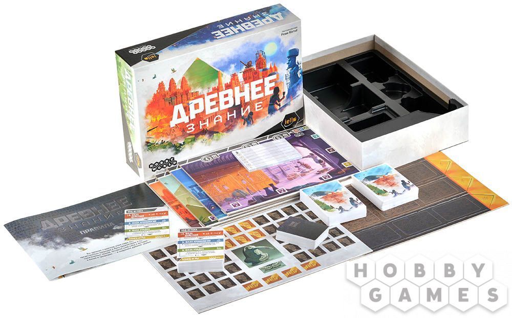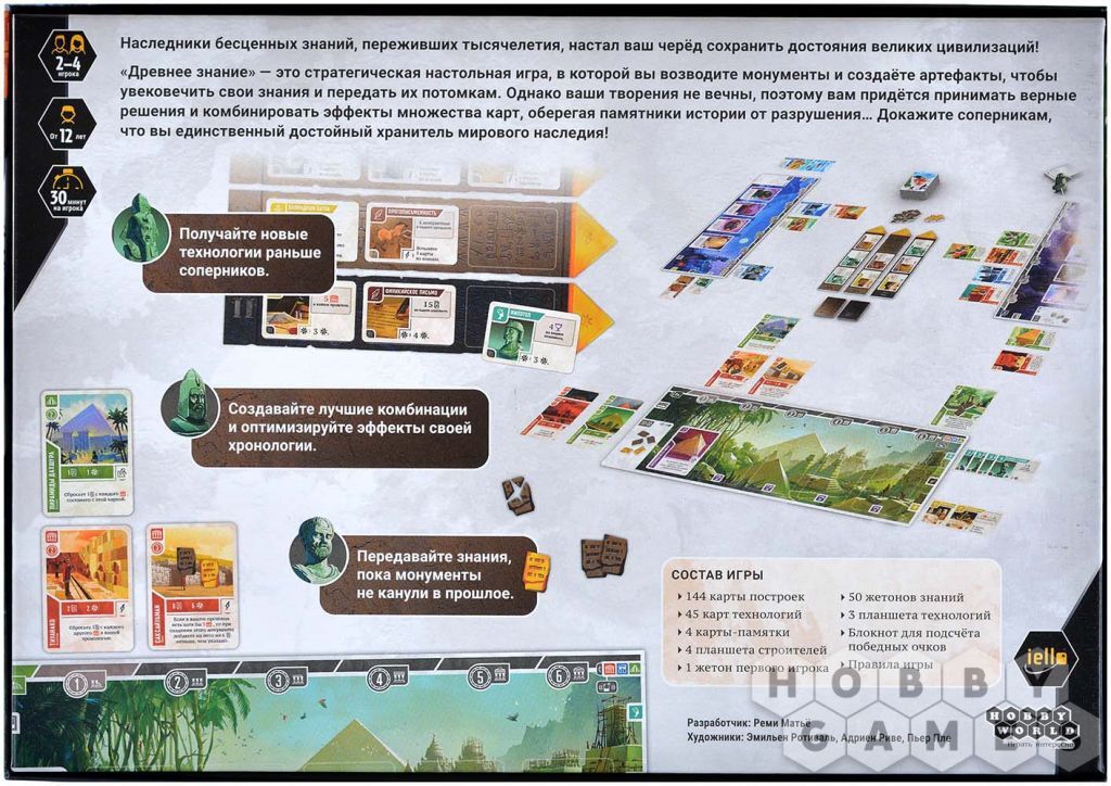 - Передача знаний: сбросьте с руки сколько угодно карт, и за каждую уберите один жетон знаний с ваших монументов