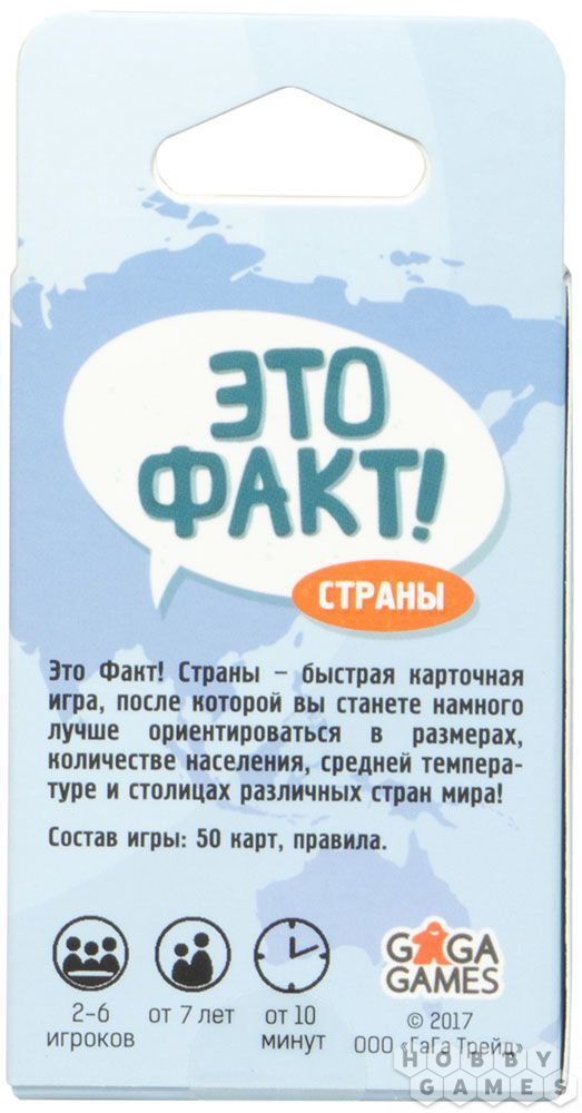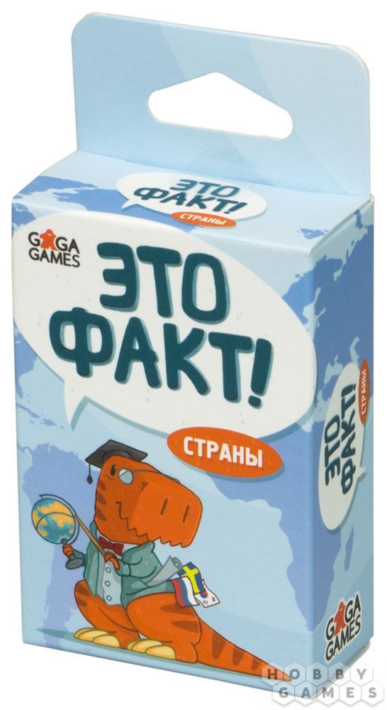 "Это Факт! Страны" – настольная карточная игра в жанре викторины, которая отлично развивает эрудицию, а также познакомит вас с географией и особенностями различных стран. В ней вам придётся сравнивать страны по различным признакам: по площади территории, численности населения, средней температуре воздуха и названию столицы. В весёлой и увлекательной форме вы узнаете множество интересных фактов про государства мира.