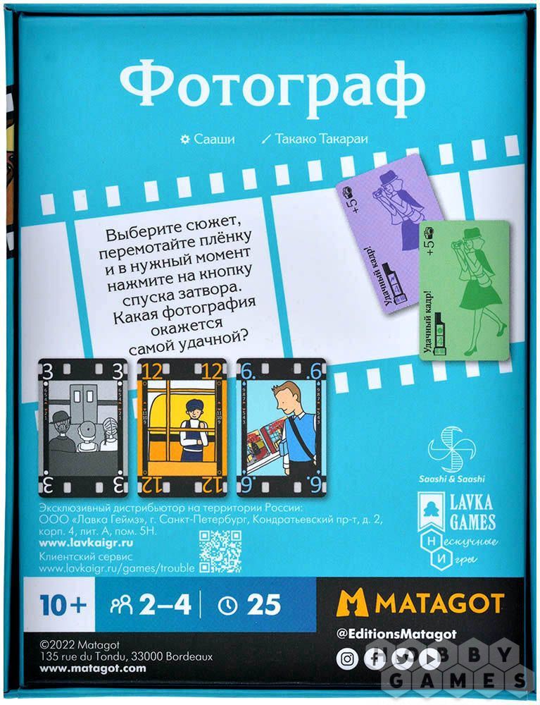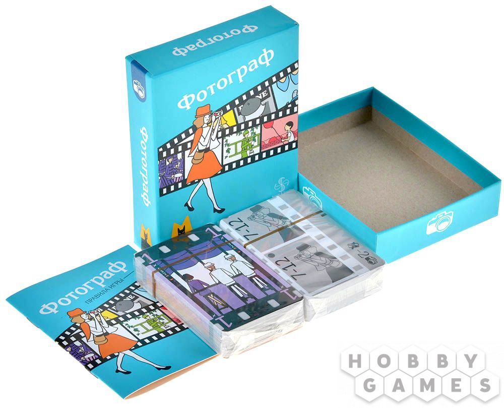 В настольной игре "Фотограф" игрокам предстоит запечатлеть кадры из жизни города. Перемешайте карты кадров и выложите их на стол согласно раскадровке (то есть, памятке). В начале игры каждый участник набирает на руку до 5 карт кадров, при этом он их сохраняет в том порядке, в котором взял (первая взятая карта должна быть крайней левой). После этого, начиная с первого игрока, все по очереди выполняют 4 действия: выбирают сюжет (берут на руку от 1 до 3 карт), перематывают плёнку (перемещают 1 карту в руке), фотографируют (разыгрывают от 1 до 3 карт) и проверяют раскадровку (выкладывают новые карты).