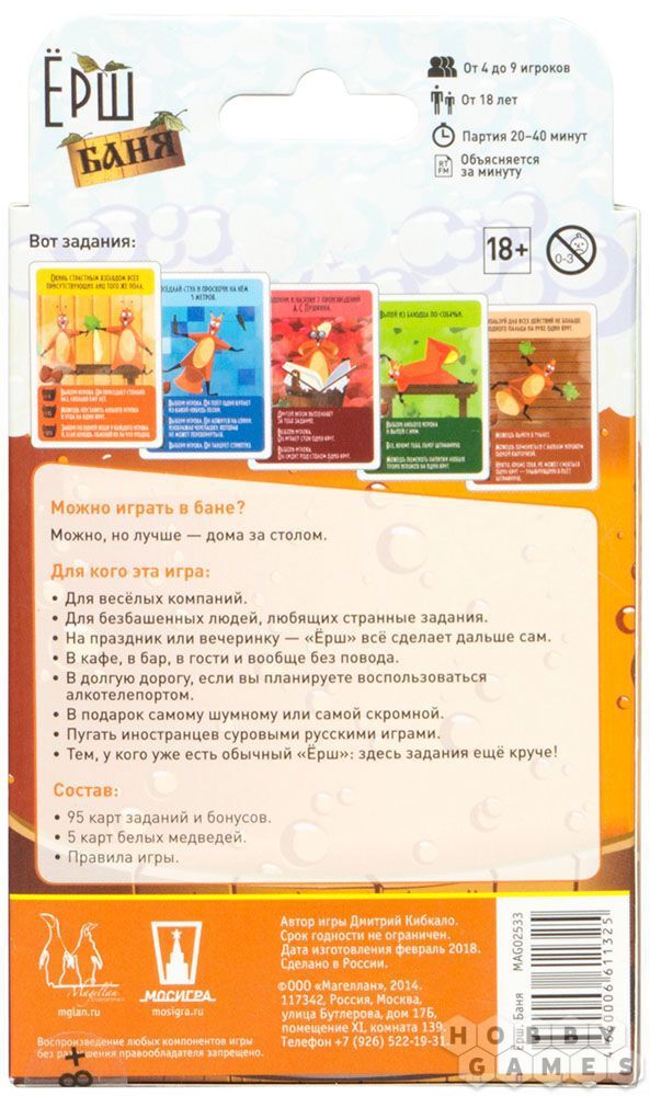 Игра "Ёрш Баня" окунёт вас в мир интересных приключений! Эта игра сможет размыть грани разумного и отлично разнообразит встречу друзей, которые умеют культурно отдыхать! В игре вы найдёте множество сложных, но смешных заданий и вопросов. Задания сложные, но победа в них повысит ваши шансы в этой непростой дуэли. Отказ или провал, в свою очередь, приблизят ту самую белочку, которая есть почти на всех картах. Сможете ли вы задержать дыхание на одну минуту, произнести вменяемый тост с полным ртом горячительного или прокатить товарища на своём горбу? Нет? – Тогда штрафную!