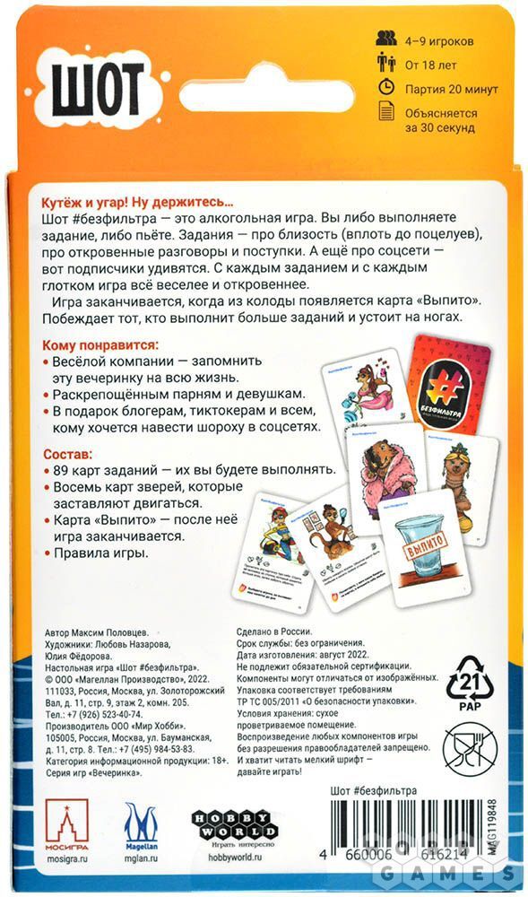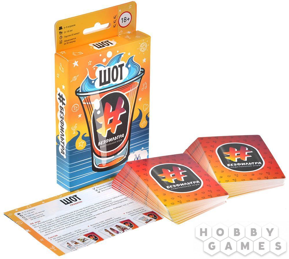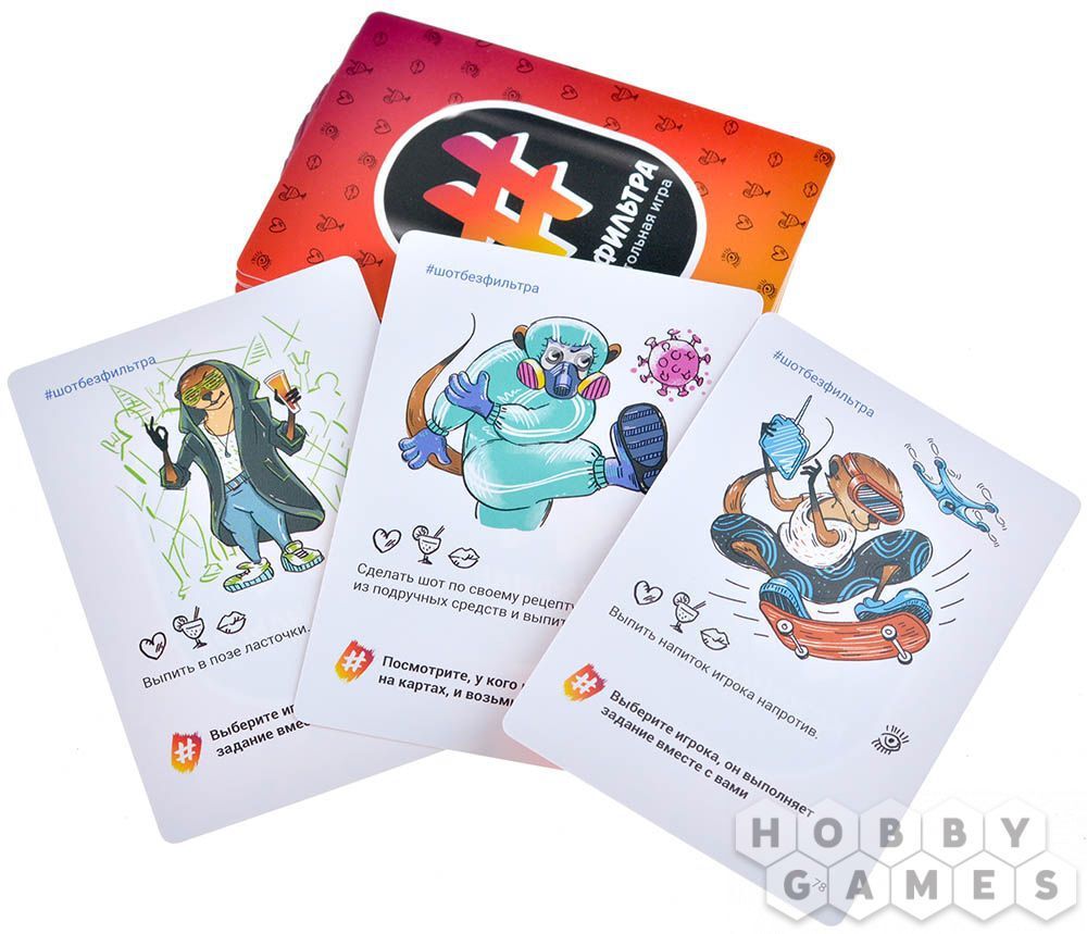 "Шот #безфильтра" – высокоградусное развлечение для весёлой компании. Это игра про близость, откровенность и треш в соцсетях. Иногда вы будете просто дурачиться, а иногда придётся постить на всеобщее обозрение в соцсетях нечто странное, так что морально приготовьтесь.