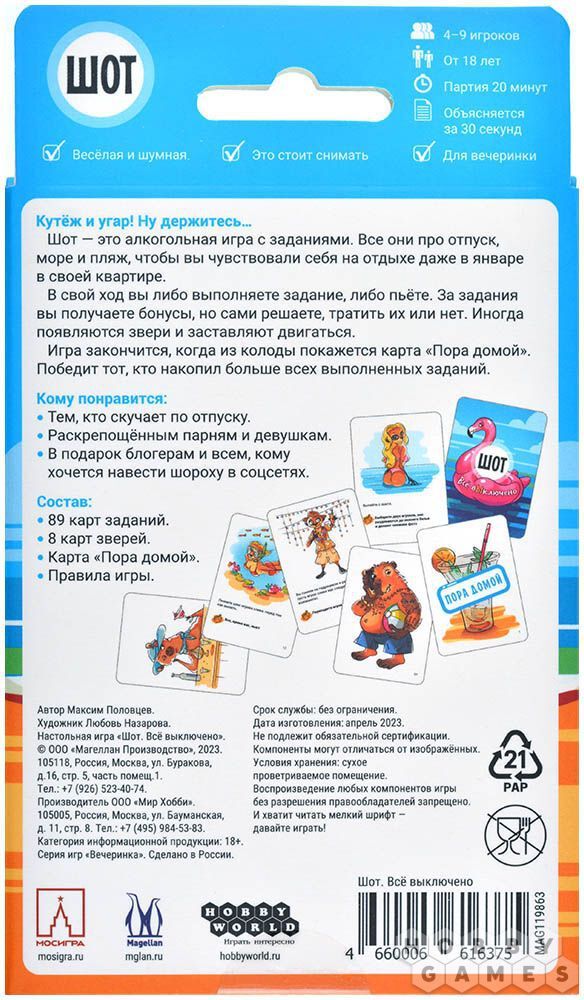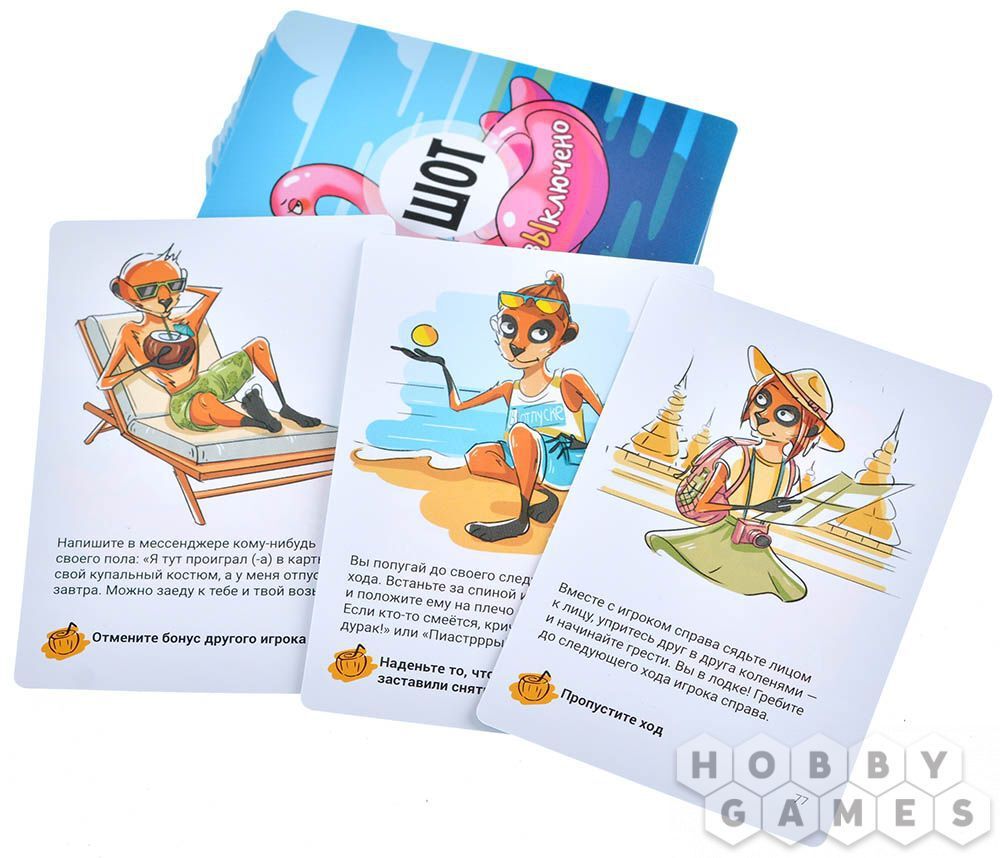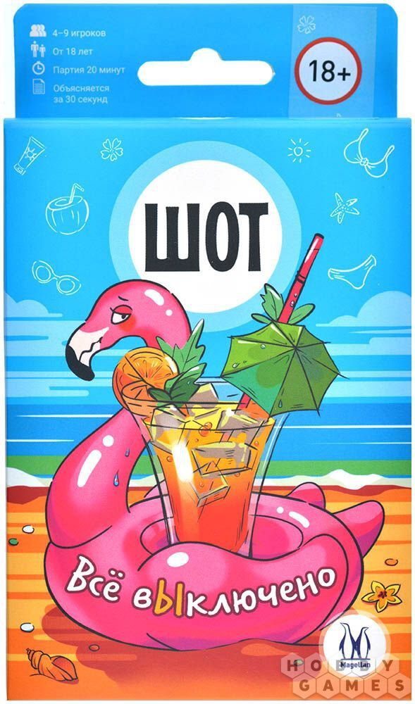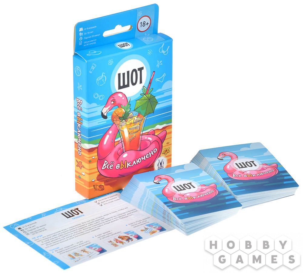 Шот – это веселая игра для вечеринки для любителей выпить на тему отпуска на море. Правила очень простые: либо выполняете задания с карточки, либо пьёте, если задание не понравилось. Игра заканчивается, когда из колоды будет вытянута карта "Пора домой".