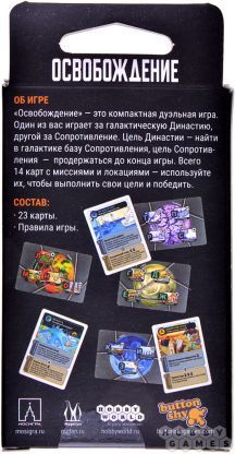 "Освобождение" – это невероятно компактная карточная игра, которая позволяет двум игрокам разыграть галактическое восстание и его подавление, используя колоду всего из 18 карт (а с дополнением, которое лежит в коробке, из 23).