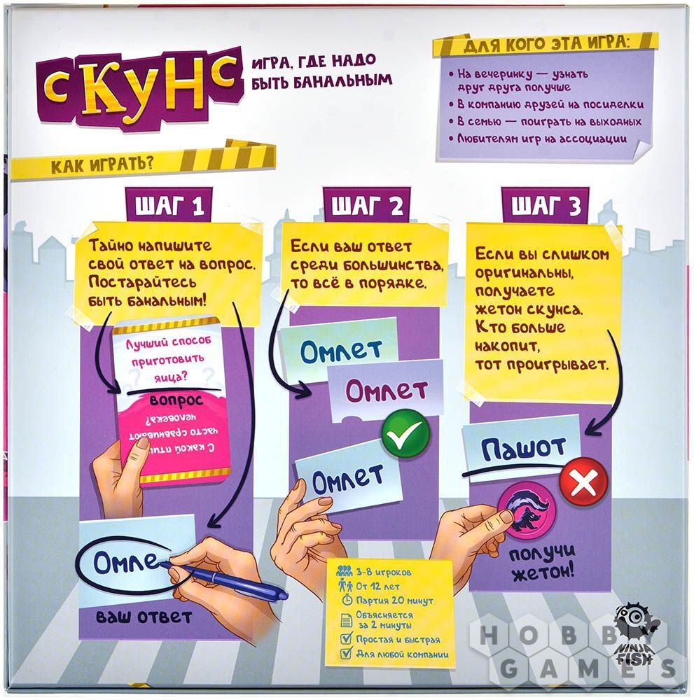 В этой игре вам предстоит отвечать на вопросы, которые случайным образом достаются из колоды карт. Ваша задача – не выделяться и вообще стараться не быть оригинальным! Ведь если ваш ответ на вопрос совпадает с ответами большинства игроков, вы получаете победные очки. А вот за неповторимость ответов, увы, вы получите только жетон скунса. Соберёте их 8, и проиграете!