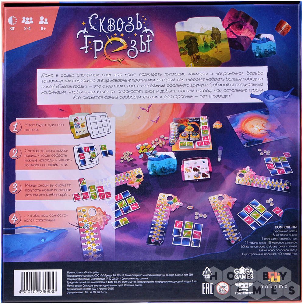 Настольная игра "Сквозь грёзы" – это в буквальном смысле сон на яву, который будут видеть все участники игрового процесса. Суть проста донельзя: перед игроками лежит общий жетон сна с ячейками, расположенными 3x3. В каждой ячейке находится либо сундук с сокровищами, либо ключ, который этот самый сундук поможет открыть, либо жуткий кошмар. А получать сокровища и прогонять кошмары игроки буду при помощи своих полимино-жетонов, которые нужно сложить в квадрат 3x3 в соответствии с ячейками на жетоне сна. Каждый сектор полимино представляет какое-то действие: одним можно взять сокровище, другим прогнать кошмар, а третьим и вовсе можно сделать всё это одновременно! Но есть и пустые сектора, которые не дадут вам ничего полезного. Задача каждого игрока составить наиболее удачную комбинацию действий, чтобы не позволить кошмарам ворваться в сон и получить как можно больше сокровищ, которые принесут победные очки.