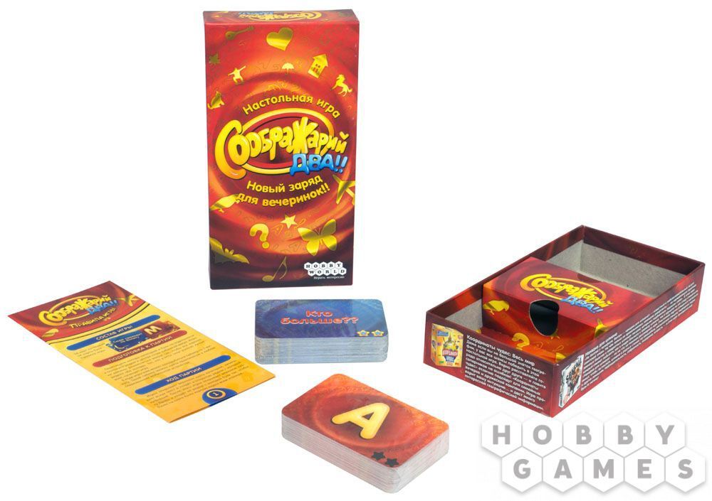 "Соображарий" – это весёлая настольная игра, которая отлично впишется в любую компанию, прекрасно дополнит любой праздник или семейный вечер, а также заставит немного подумать. Развивайте кругозор и словарный запас в увлекательной форме! Простые правила и небольшая коробка позволят брать игру на природу, в кафе или в путешествие. Непродолжительные партии и одновременное участие всех игроков не дадут заскучать! Если же вы, наоборот, хотите устроить настоящий турнир, вы можете объединить "Соображий Два!!" с классическим "Соображарием" и играть, например, до трёх побед.