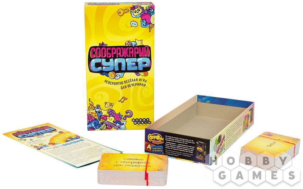 В версии "Соображарий Супер" вы не найдёте привычной по оригинальному "Соображарию" колоды букв: вместо этого здесь есть увеличившаяся вдвое стопка карт категорий. В каждый ход игроки будут видеть лицевую сторону двух карт, пытаясь как можно быстрее придумать ответ, который подходил бы под обе записанные на карточках категории. За правильные ответы игроки получают право забирать себе карточки, за которые в конце партии начисляются призовые очки.