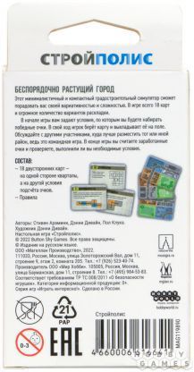 Карточная настольная игра "Стройполис" представляет собой минималистичный градостроительный симулятор. В коробке вы найдёте двухсторонние карты: на одной стороне представлены условия, придерживаясь которых можно заработать дополнительные победные очки. А другая сторона поделена на 4 части – это кварталы (коммерческий, парковый, жилой и индустриальный), каждый из которых обозначен своим цветом. В процессе игры вам предстоит обсуждать с другими игроками, как лучше разместить новый участок, при этом карты друг друга вы видеть не будете. Исходя из того, что на одной карте находится сразу 4 разных квартала, можно догадаться, что выкладывать карты лучше всего друг к другу одинаковыми сторонами, чтобы строились максимально возможные зоны одного типа. Но через кварталы также проходят дороги, за каждую из которых вы будете терять по одному очку в конце игры. Так что приложите все усилия и постарайтесь построить город с одним завершённым участком дороги.