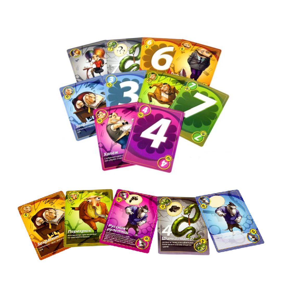 – Змеиные карты этикета - их можно вручить сопернику вместе с двумя штрафными картами из своей руки, если заметите, что он положил руку на стол (карта «Шштол!») или если он ответил на любой ваш вопрос (карта «Шшто?»)...