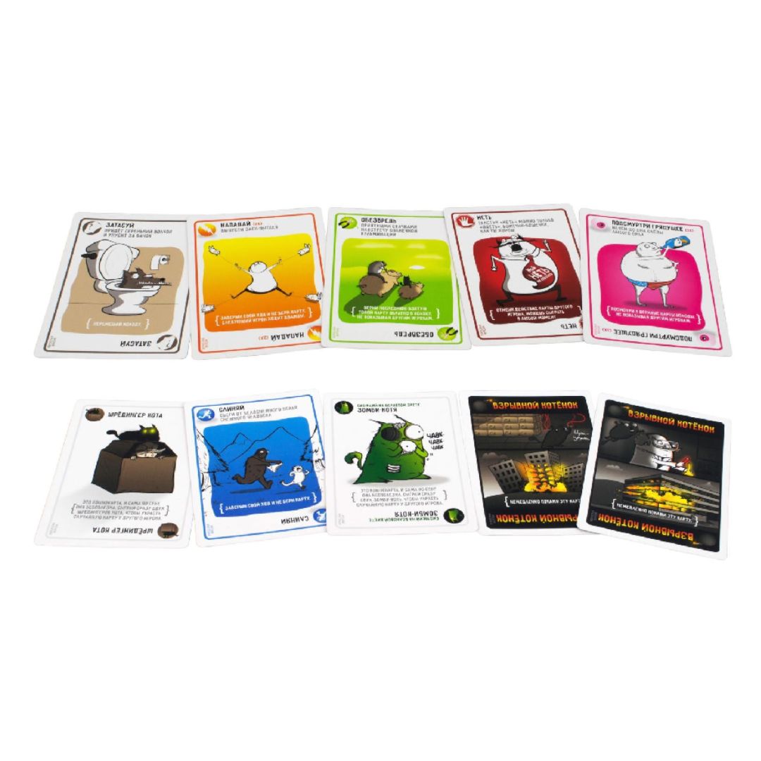 Игра предлагает быстрый и динамичный игровой процесс, где вам придётся взвешивать риски. Игра отдалённо напоминает своим принципом "русскую рулетку" – игроки тянут по очереди карты из колоды, и, если им попадается один из взрывных котеек, то он тут же взрывается и выбывает из игры! Для того, чтобы этого не произошло, можно использовать различные карты или даже их комбинации.